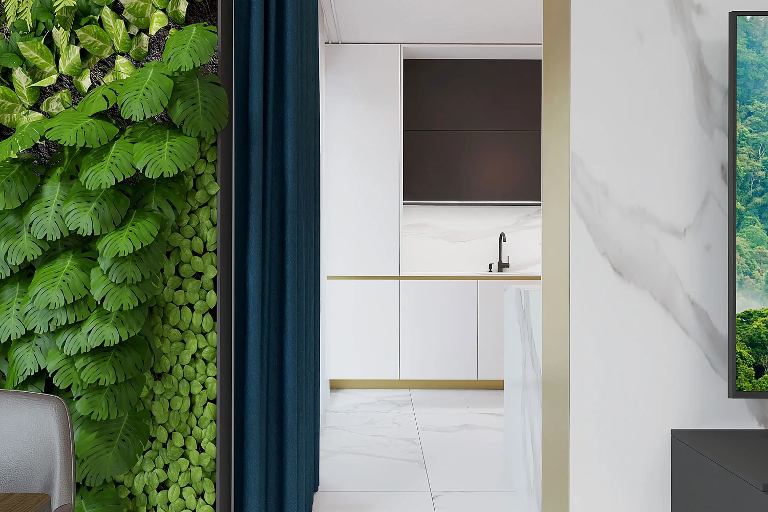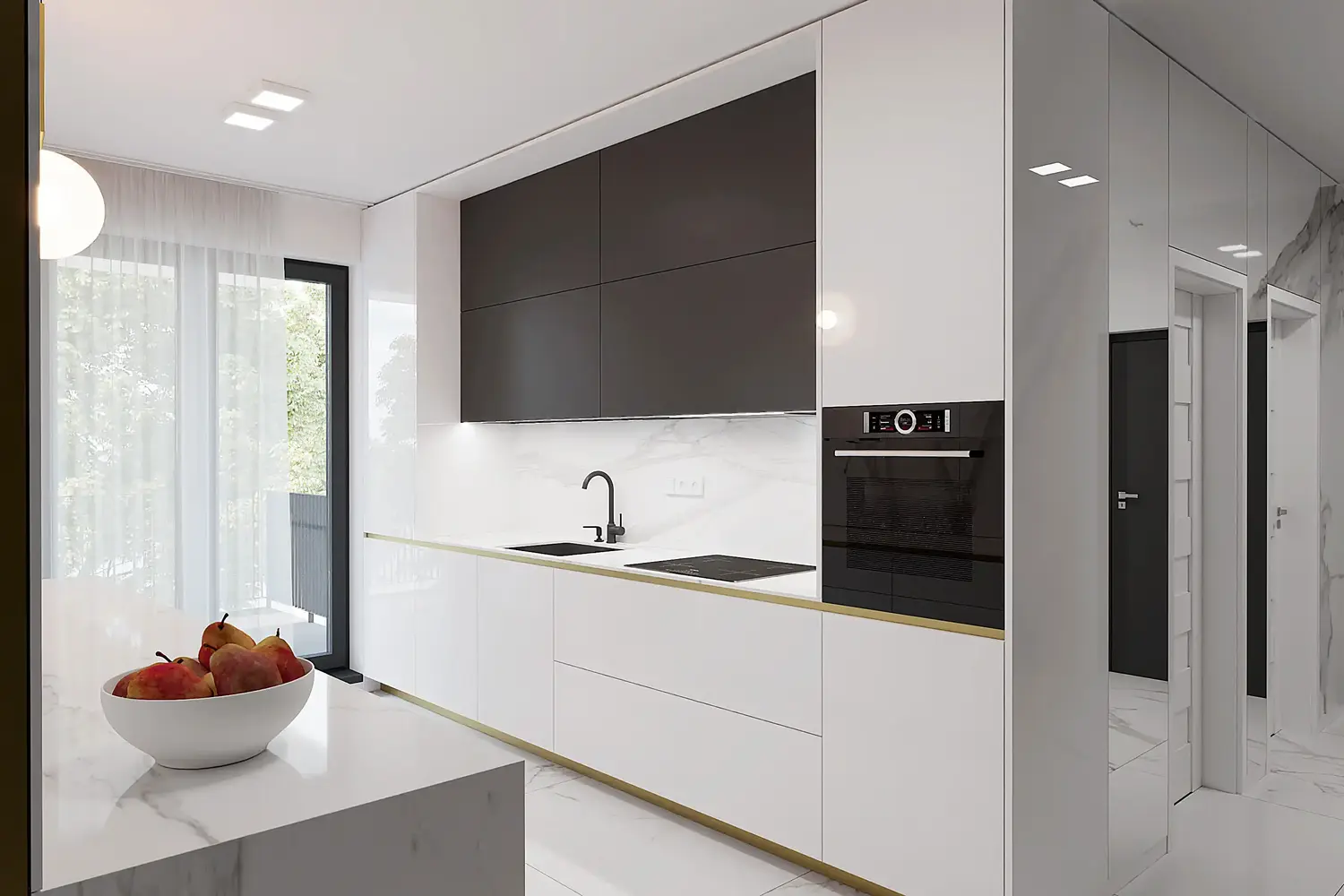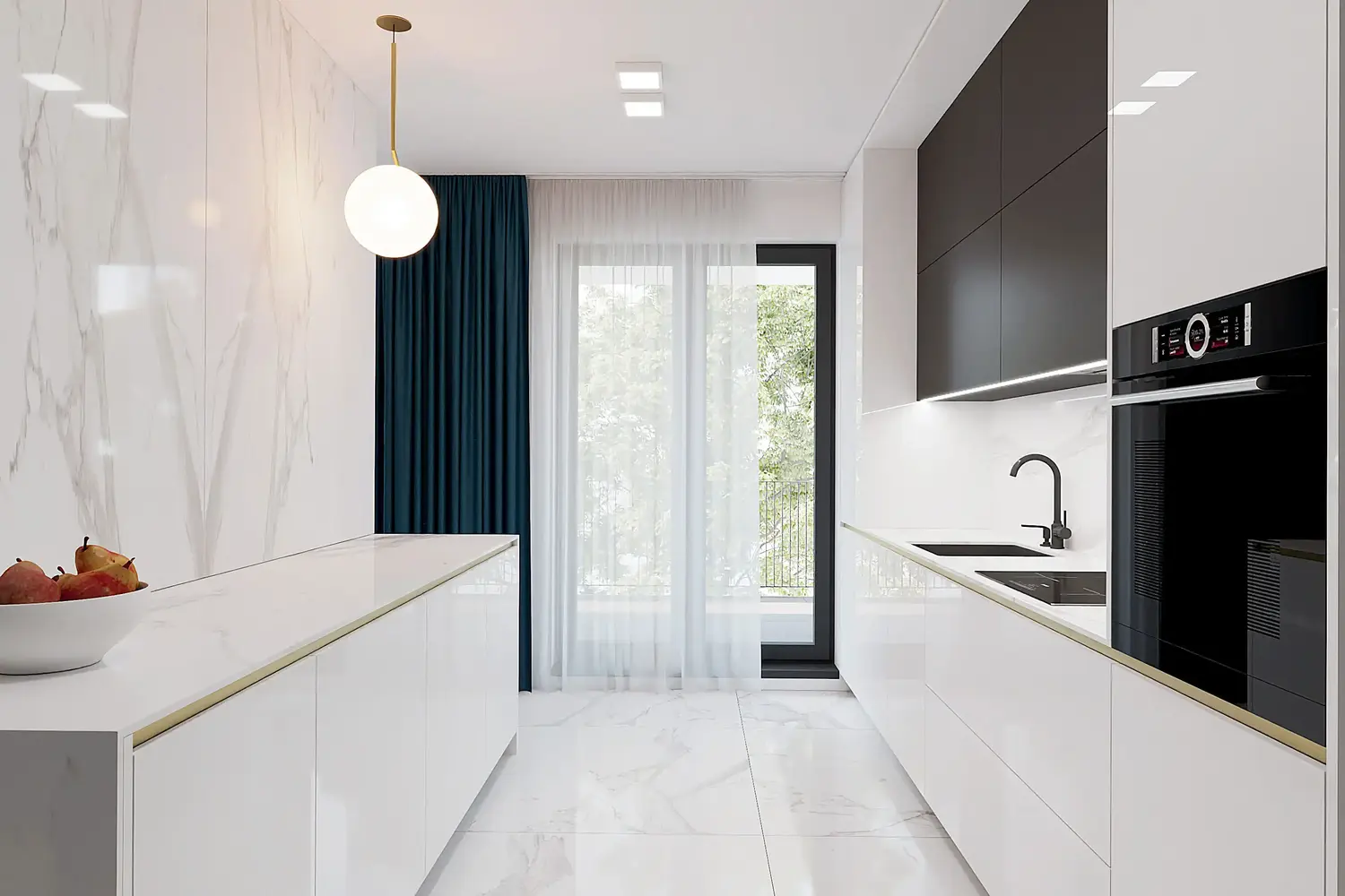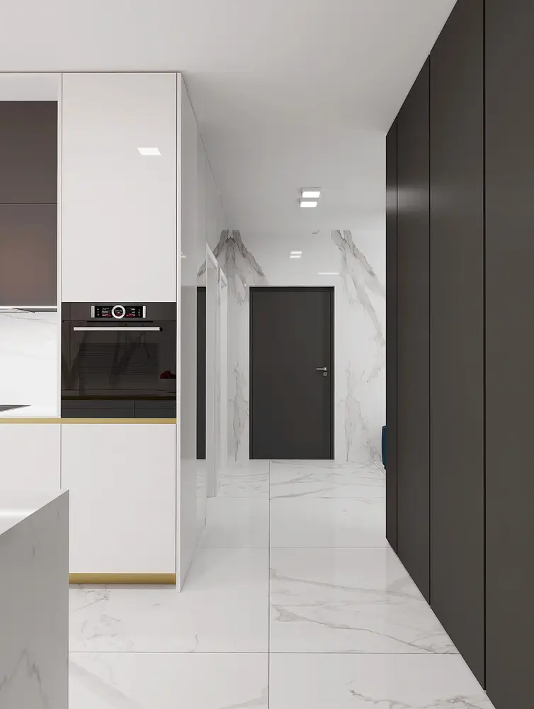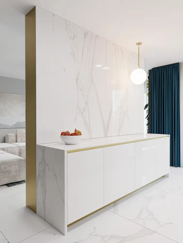Na podlahu sme navrhli veľkoformátovú dlažbu s mramorovým efektom Calacatta, ktorá podčiarkuje eleganciu a moderný dizajn bytu. Nadčasová a univerzálna biela kuchynská linka vytvára základ pre dizajn, ktorý sa výborne kombinuje s ďalšími farebnými odtieňmi či materiálmi, ako je drevo. Viac informácií o postupe pri návrhu interiéru sa dočítate tu.