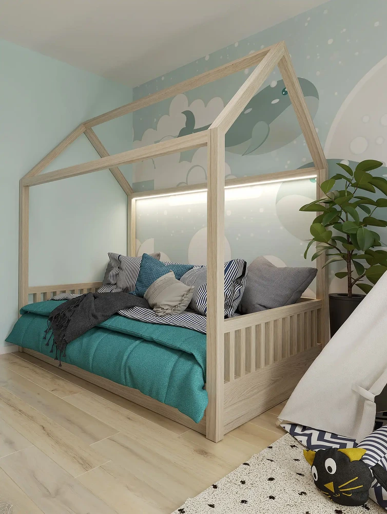 Tapeta na mieru obohacuje dizajn izby a rozvíja fantáziu a hravosť detského sveta. Nadčasový charakter izby dopĺňa nábytok vyrobený na mieru, ktorý spĺňa praktické potreby a zároveň zanecháva izbu esteticky čistú a funkčnú. Hľadáte interiérového dizajnéra?