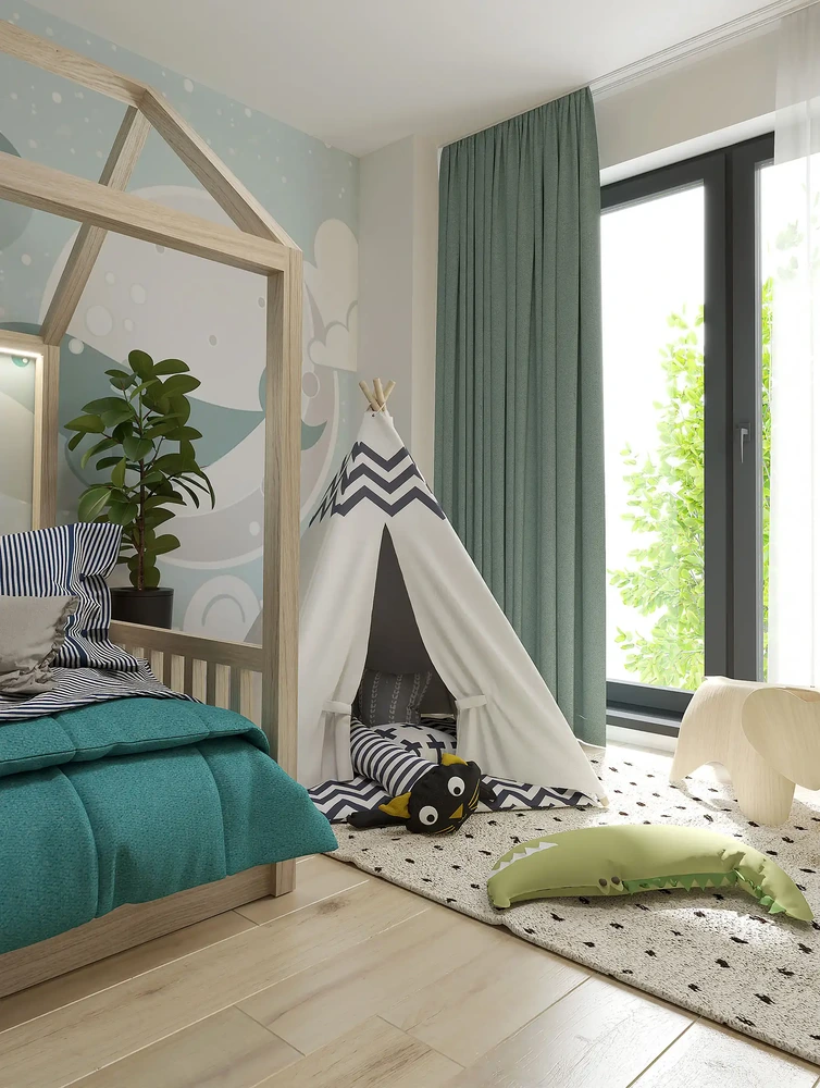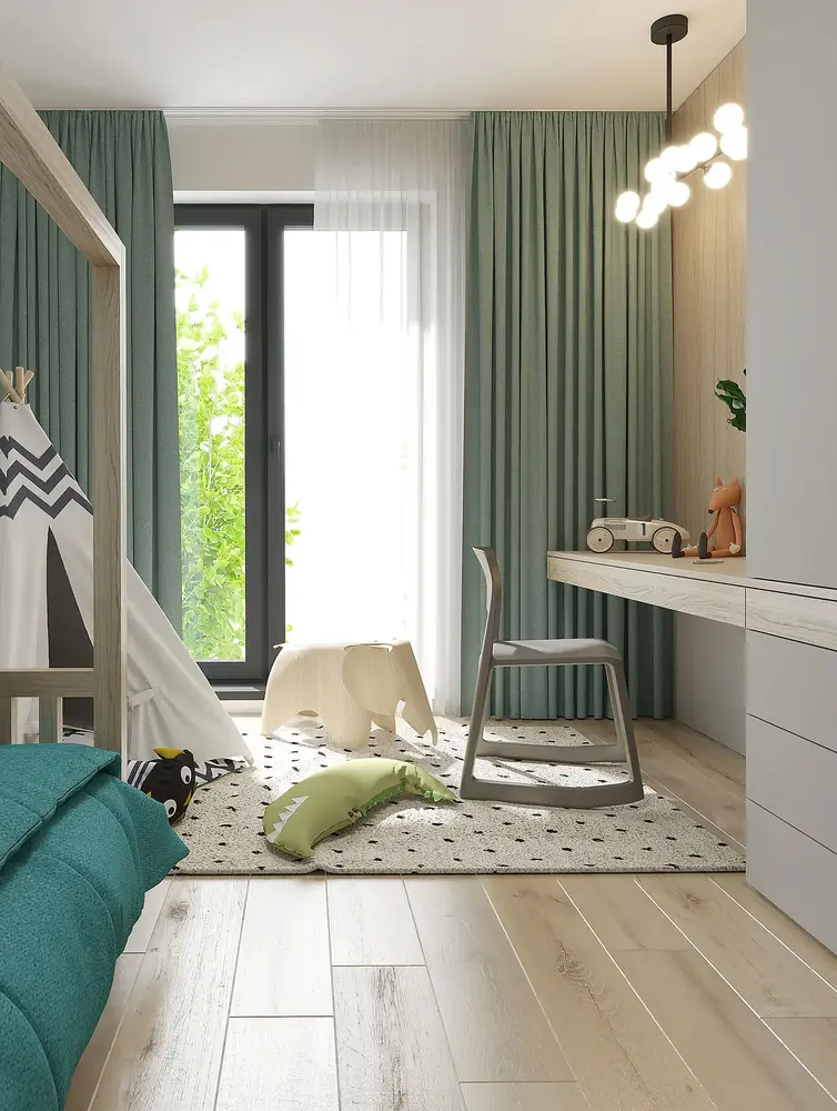 Detskú izbu pre chlapca sme navrhli v teplých zemitých farbách, aby pôsobila príjemne a útulne. V kontraste k bielym a mramorovým povrchom zvyšku bytu sme tu zvolili odlišný prístup. Drevené prvky na nábytku a podlahe vytvárajú harmonický základ, ktorý podporuje útulnosť a pohodlie. Na oživenie sme pridali bledomodrú farbu na stenách a závesoch pre oživenie izby. Návrhy detských izieb môžete vidieť tu.