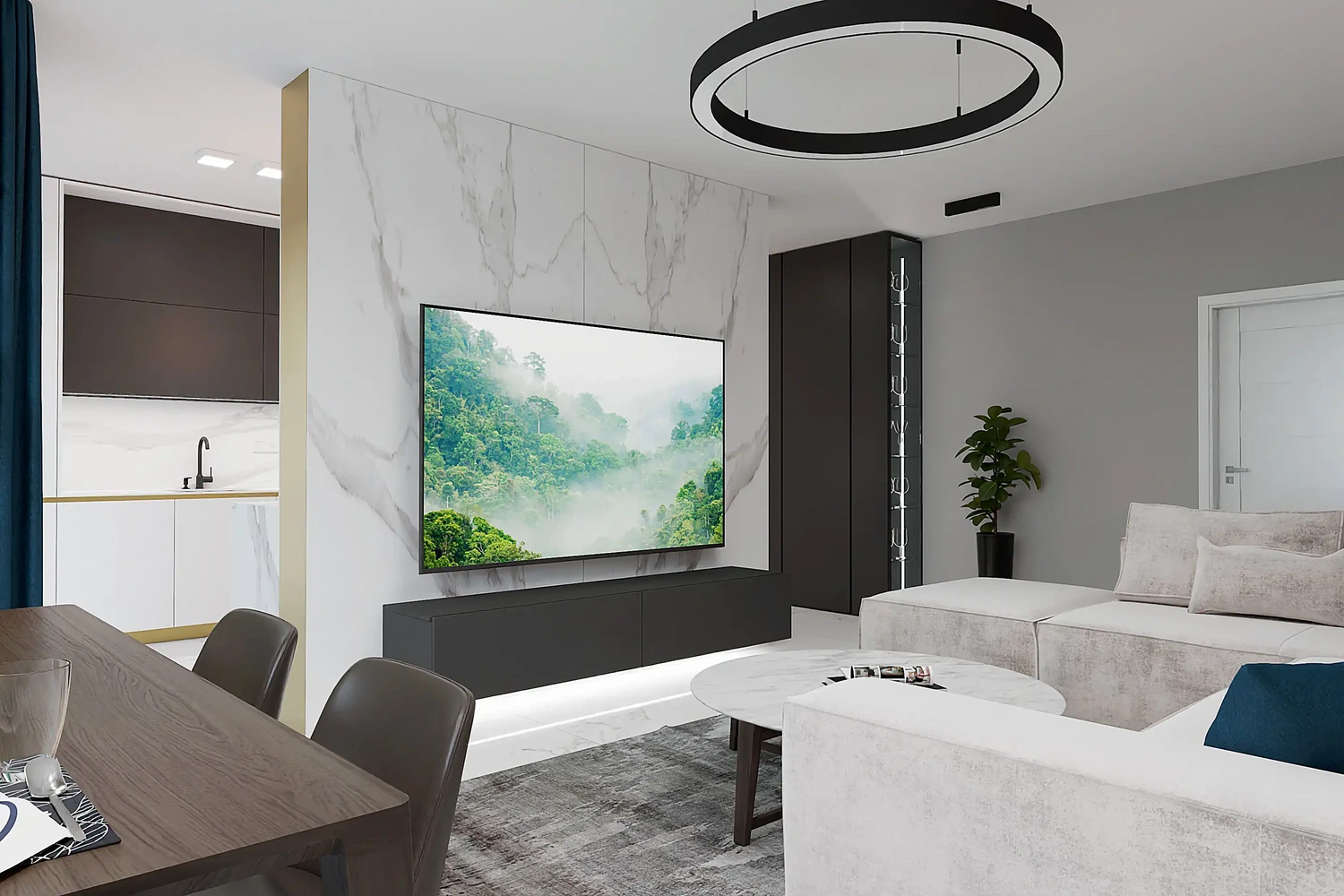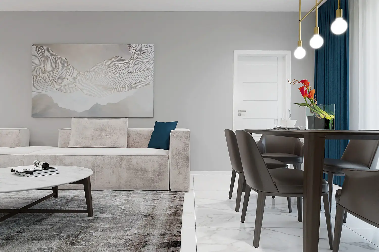 Tento moderný dizajn bytu sme vytvorili predovšetkým na propagačné účely, aby sme potenciálnym kupujúcim poskytli inšpiráciu a predstavu, ako sa dá ich budúci priestor zariadiť. Vizualizácie slúžia ako pomôcka, ktorá budúcim vlastníkom umožňuje lepšie si predstaviť dizajn a usporiadanie interiéru. Interiérový dizajn dvojizbového bytu v Treepark Residence Čadca sme navrhli v moderných, čistých líniách s jemným nádychom luxusu. O službách nášho interiérového štúdia sa dozviete tu.