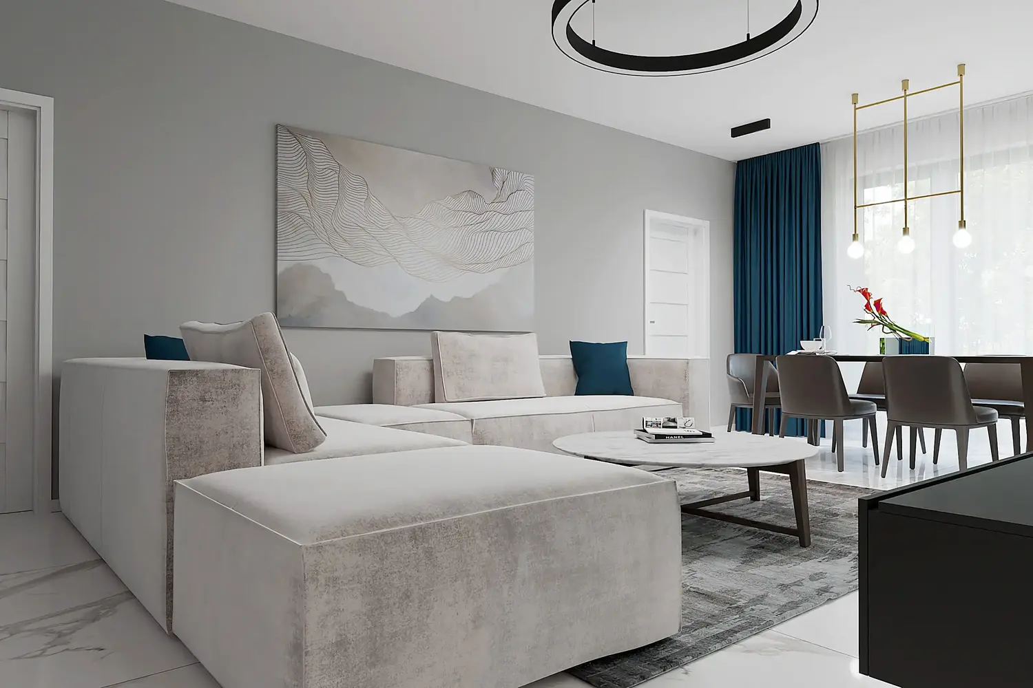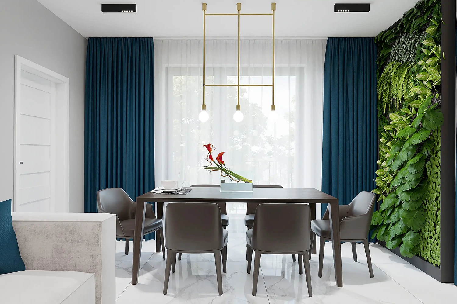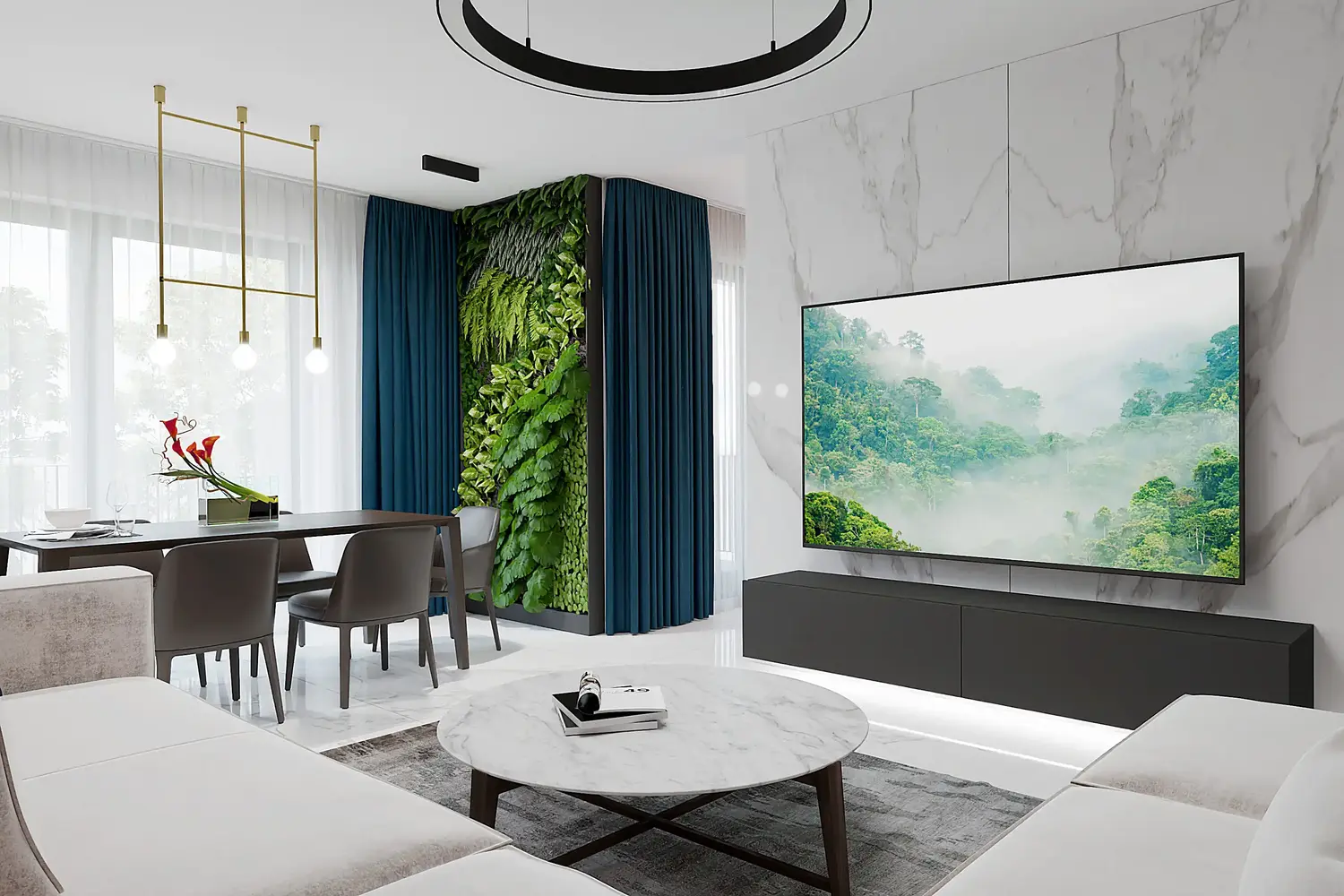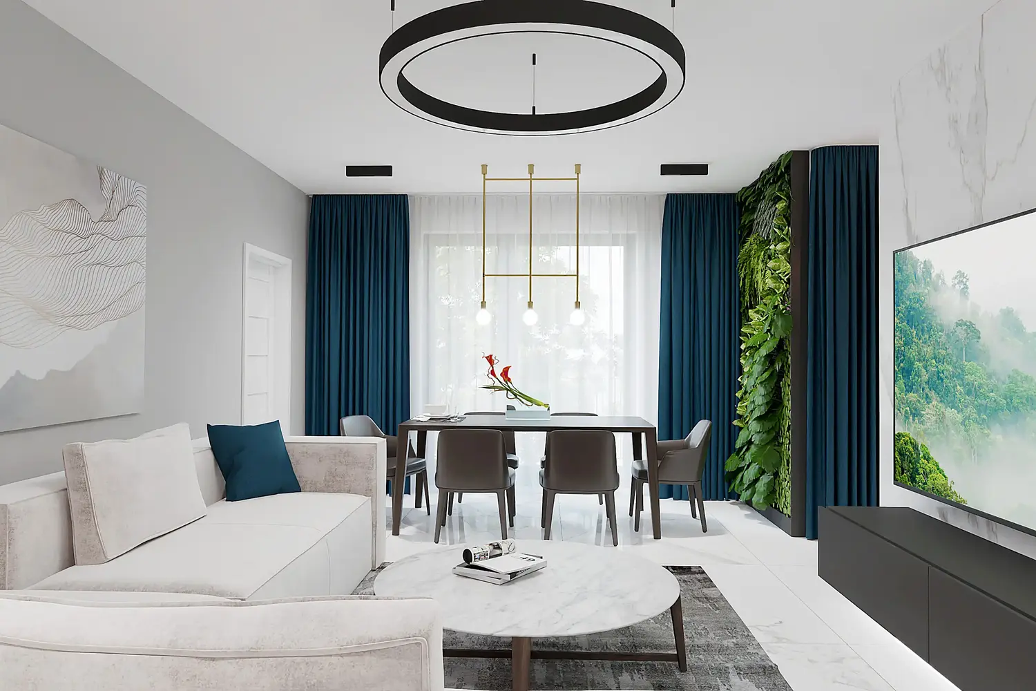 Celý dizajn bytu sme navrhli v neutrálnych odtieňoch s dominanciou bielej, ktorú v kontraste dopĺňajú čierne a tmavohnedé prvky na menších častiach nábytku. Ako doplnkovú farbu sme zvolili modrú na závesoch, ktorá spolu so zelenou stenou vo forme vertikálnej záhrady v jedálenskej časti vnáša do priestoru sviežosť. Vďaka prepojeniu obývačky a jedálne zelená stena harmonicky dopĺňa tento moderný dizajn bytu a príjemne ho oživuje. Ďalšie návrhy obývačiek nájdete tu.