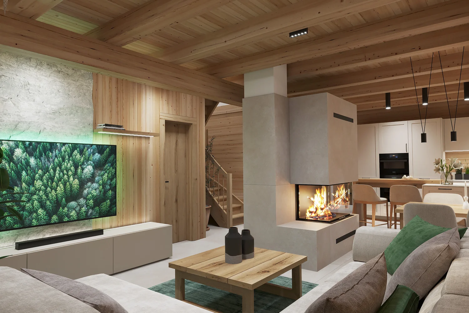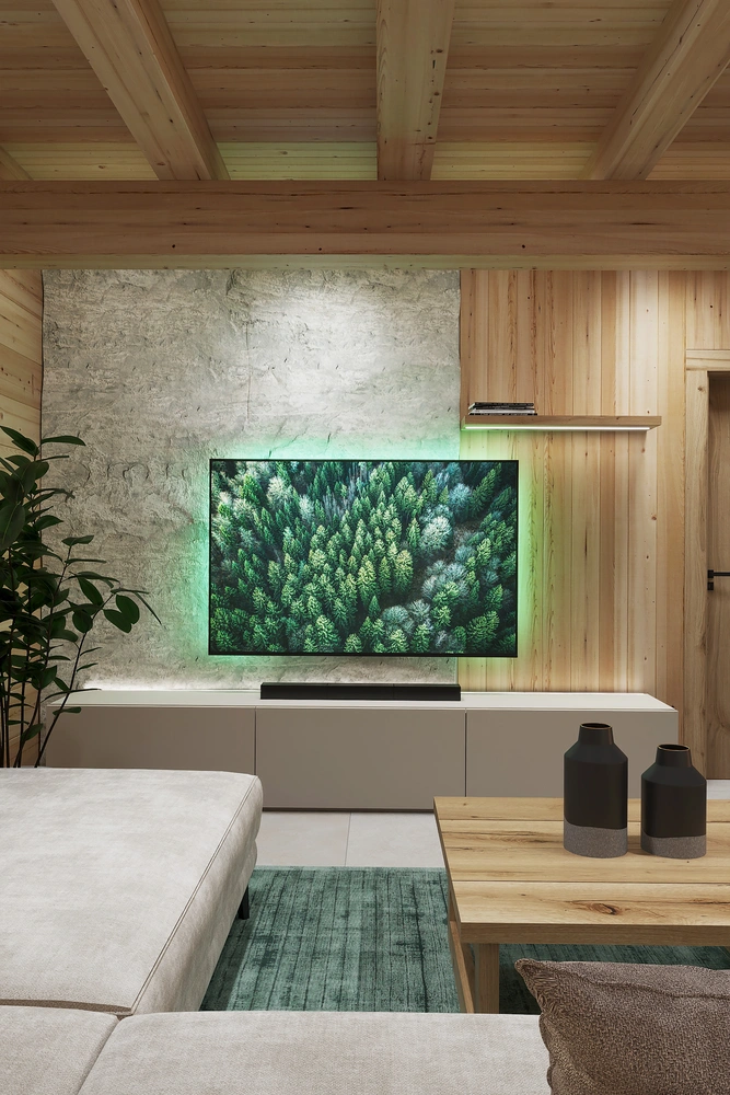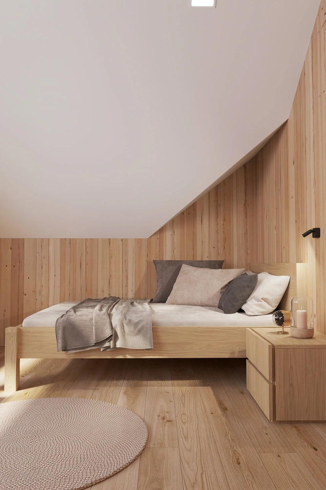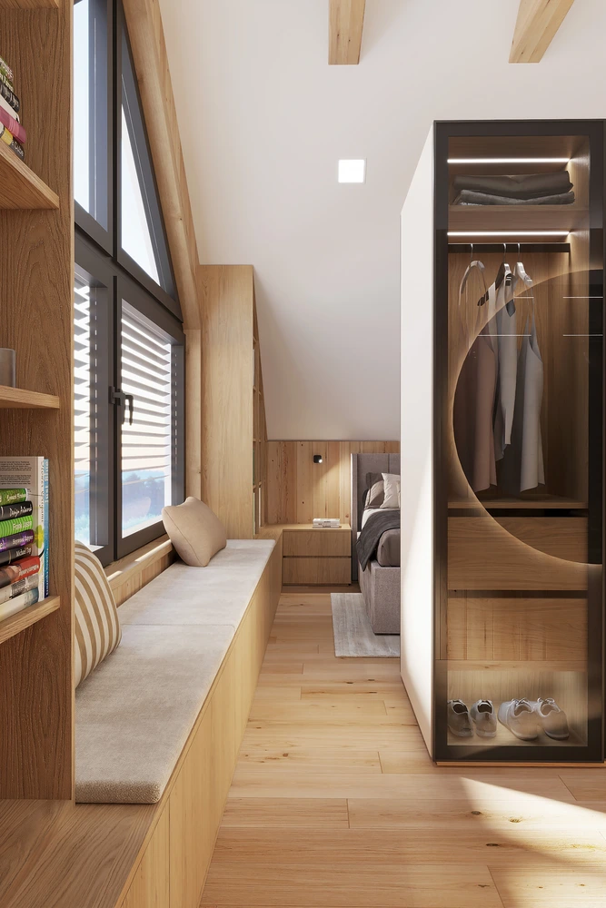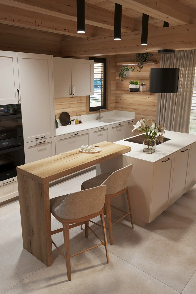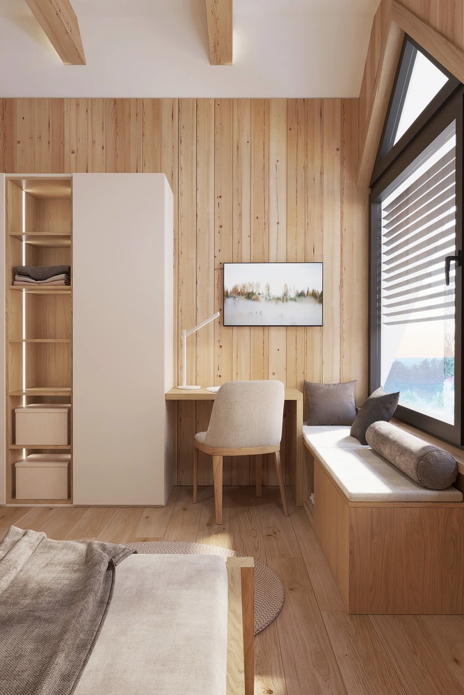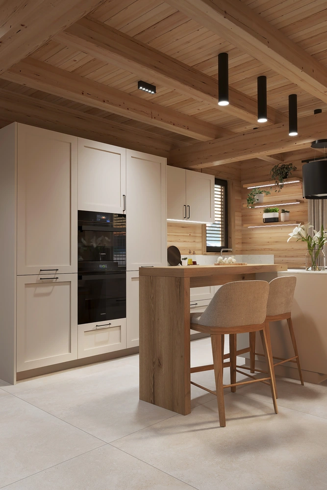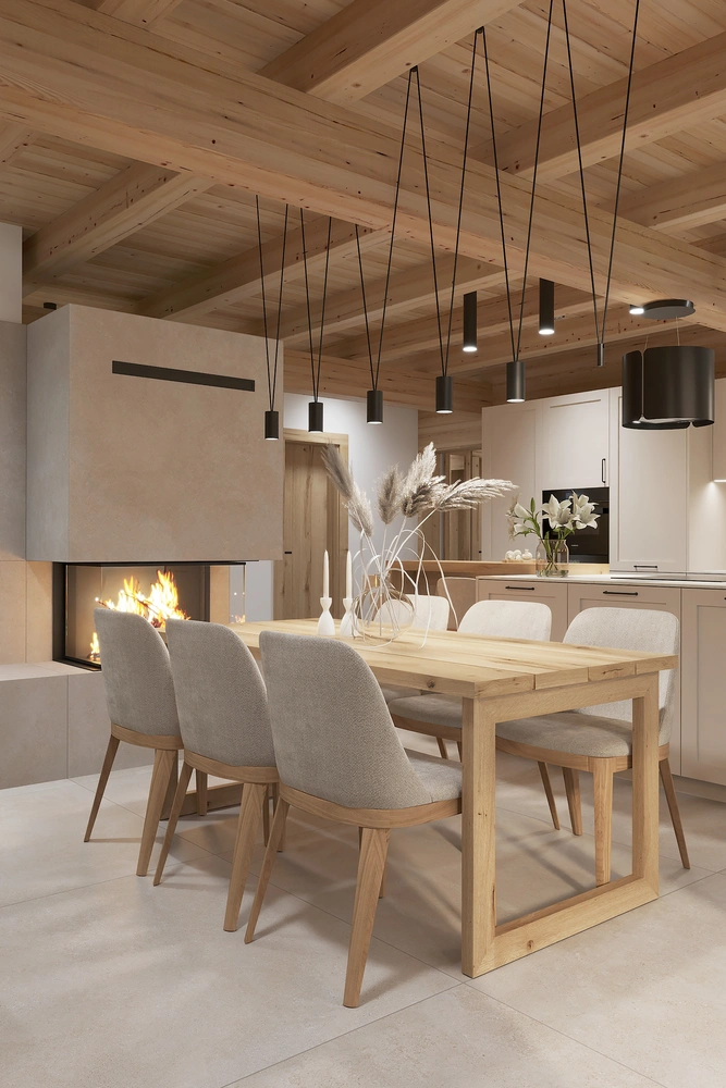 Interiér chaty na Makove sme navrhli moderne s prvkami vidieckeho štýlu. Chata vyžaruje útulnú atmosféru vďaka dreveným konštrukciám a čistým líniám interiérových prvkov. Interiér drevenej chaty spája modernosť s tradičnou atmosférou drevenice.