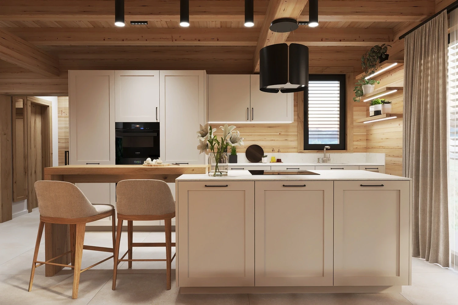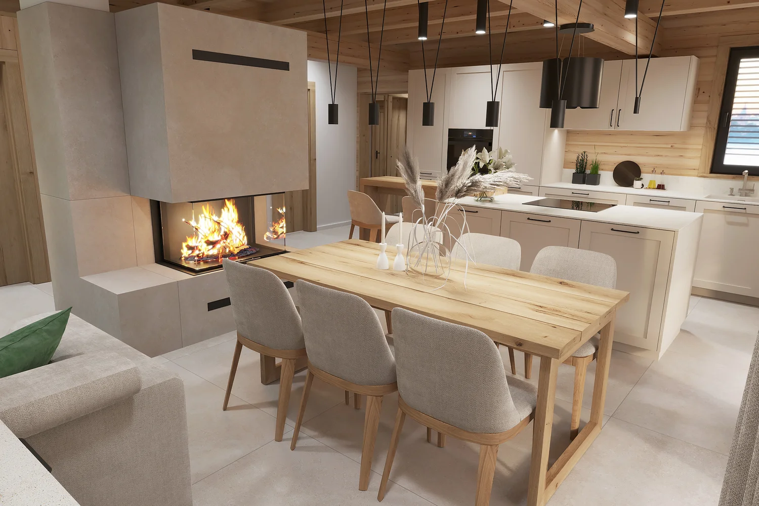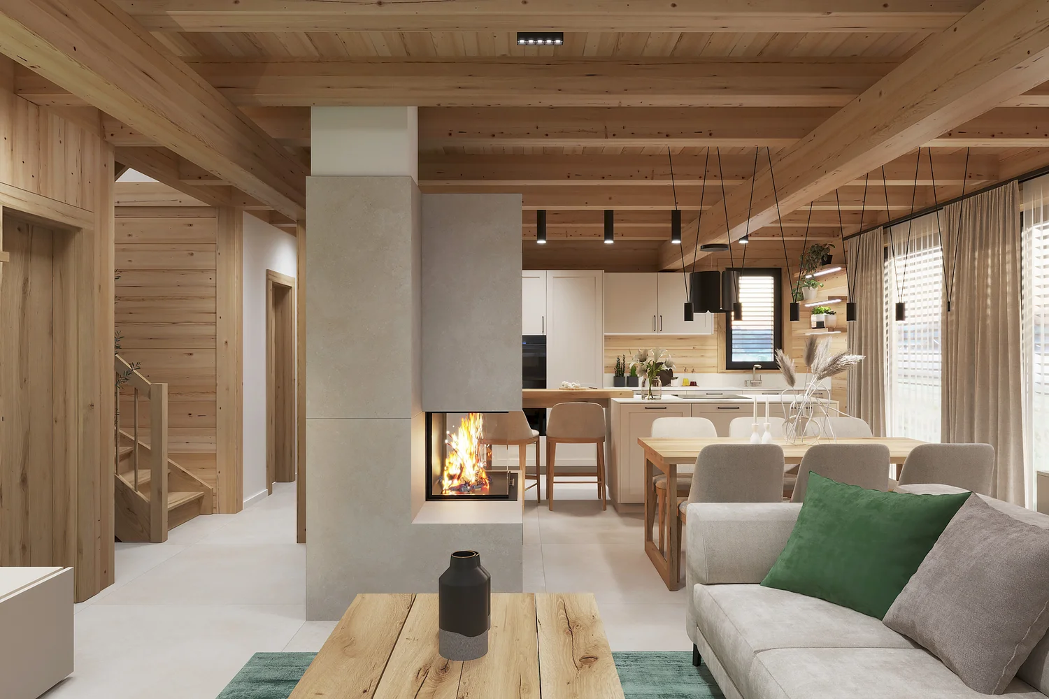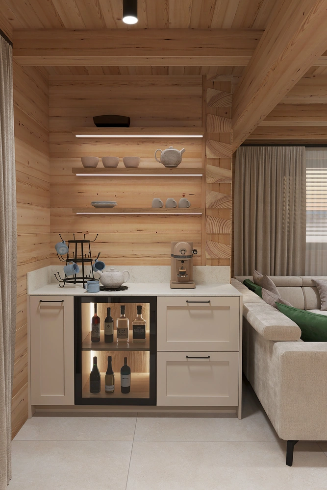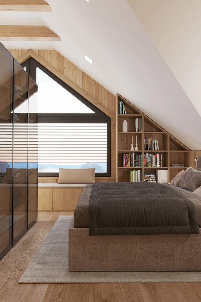 Interiér chaty na Makove sme navrhli moderne s prvkami vidieckeho štýlu. Chata vyžaruje útulnú atmosféru vďaka dreveným konštrukciám a čistým líniám interiérových prvkov. Interiér drevenej chaty spája modernosť s tradičnou atmosférou drevenice.