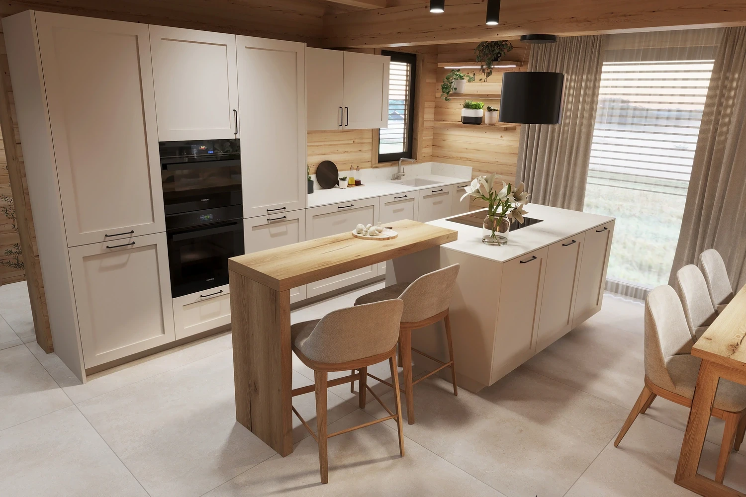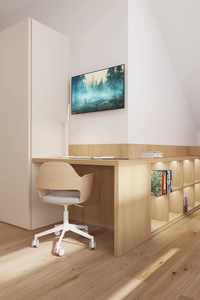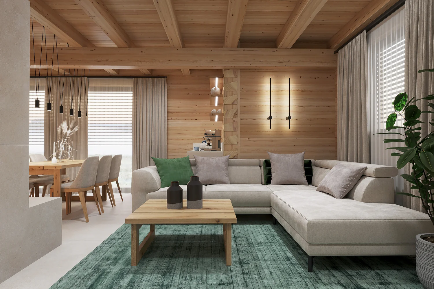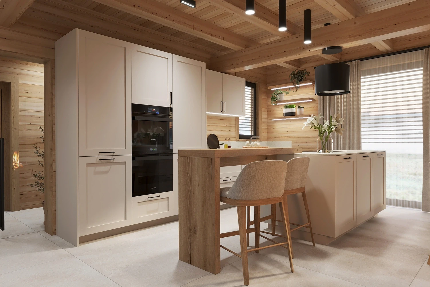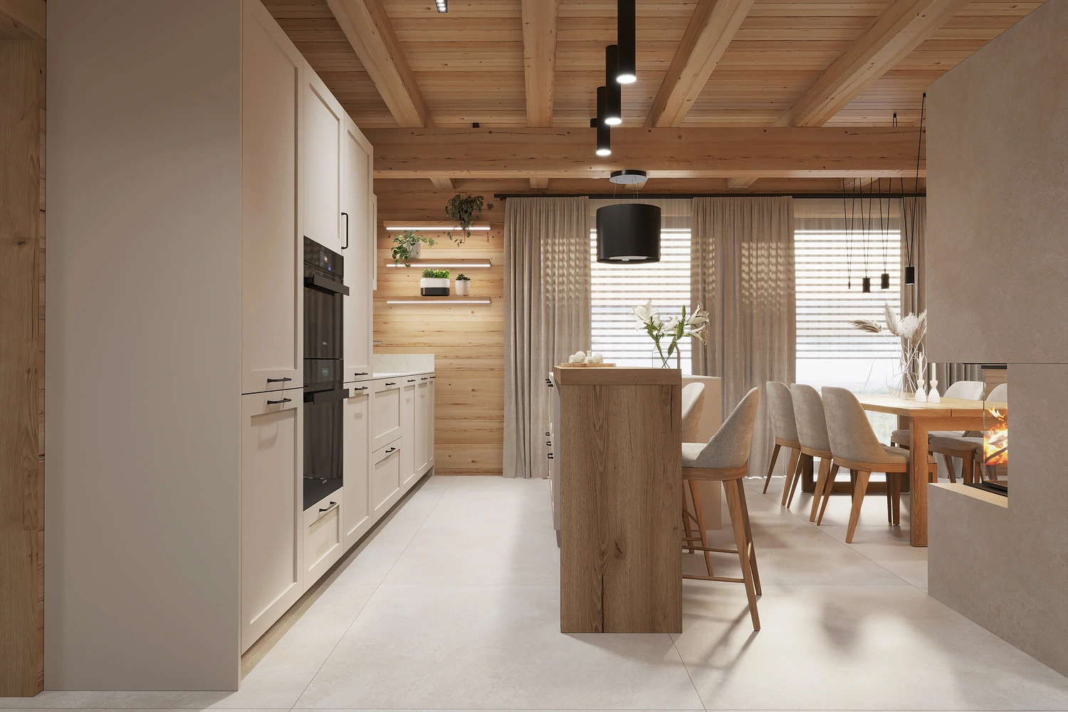 Interiér chaty na Makove sme navrhli moderne s prvkami vidieckeho štýlu. Chata vyžaruje útulnú atmosféru vďaka dreveným konštrukciám a čistým líniám interiérových prvkov. Interiér drevenej chaty spája modernosť s tradičnou atmosférou drevenice.