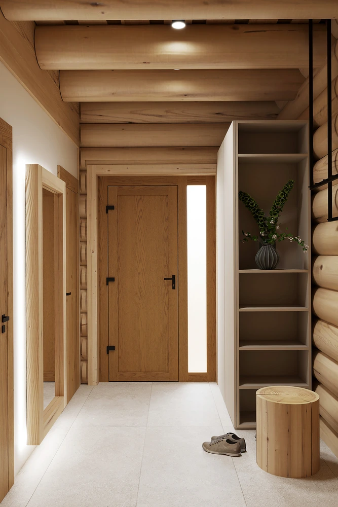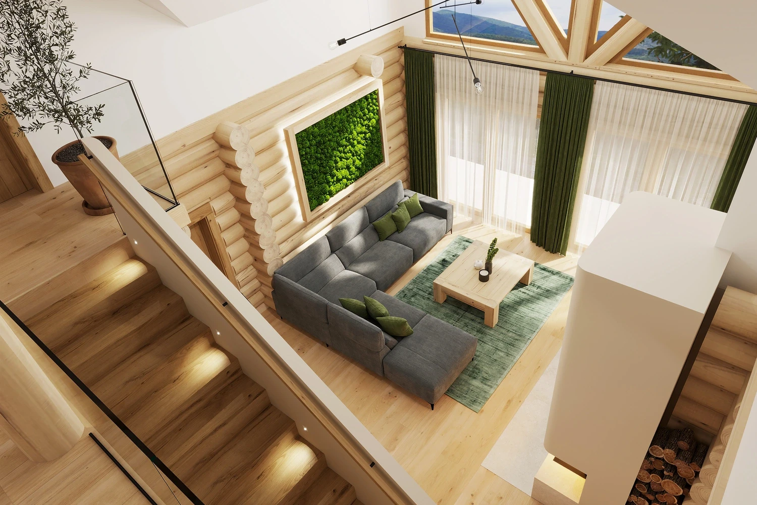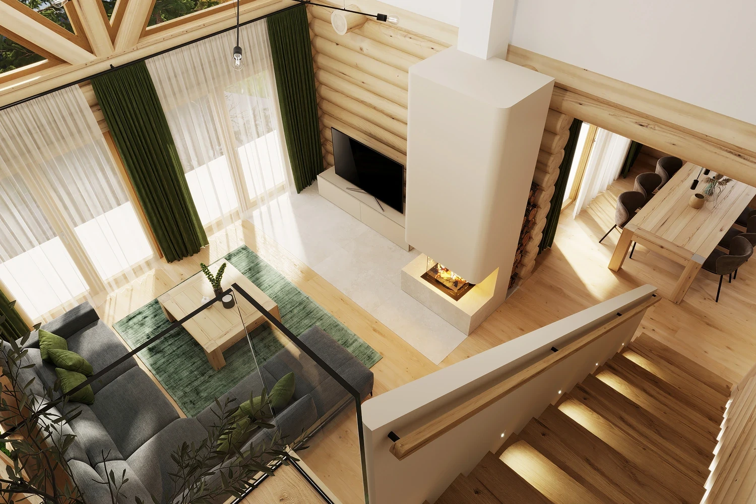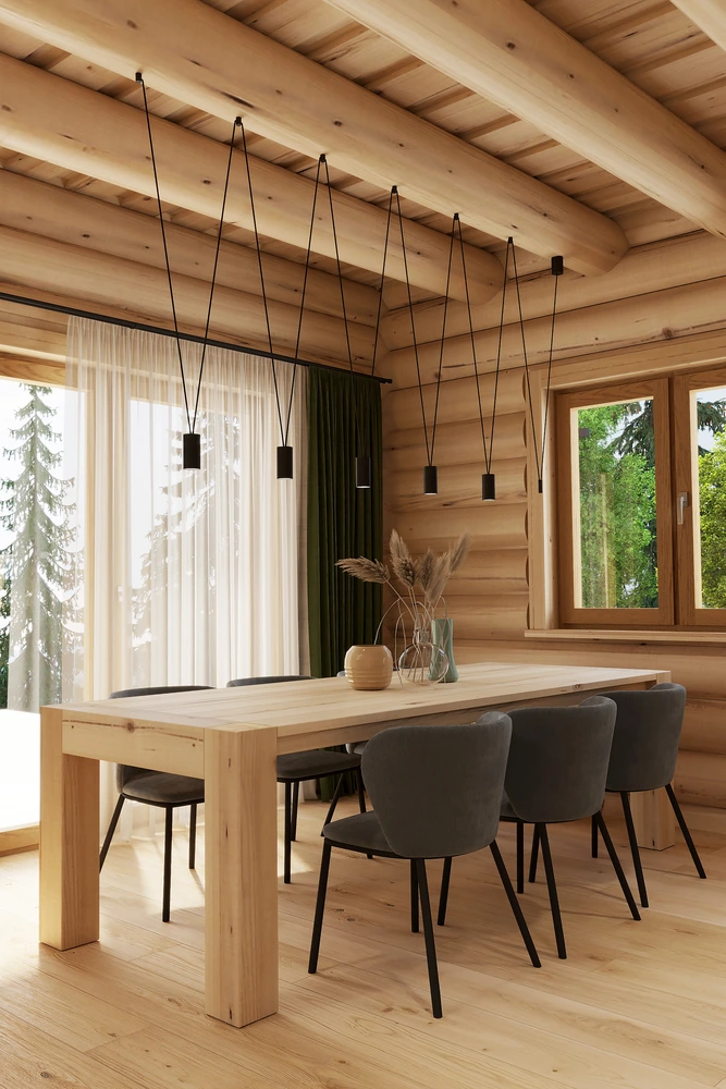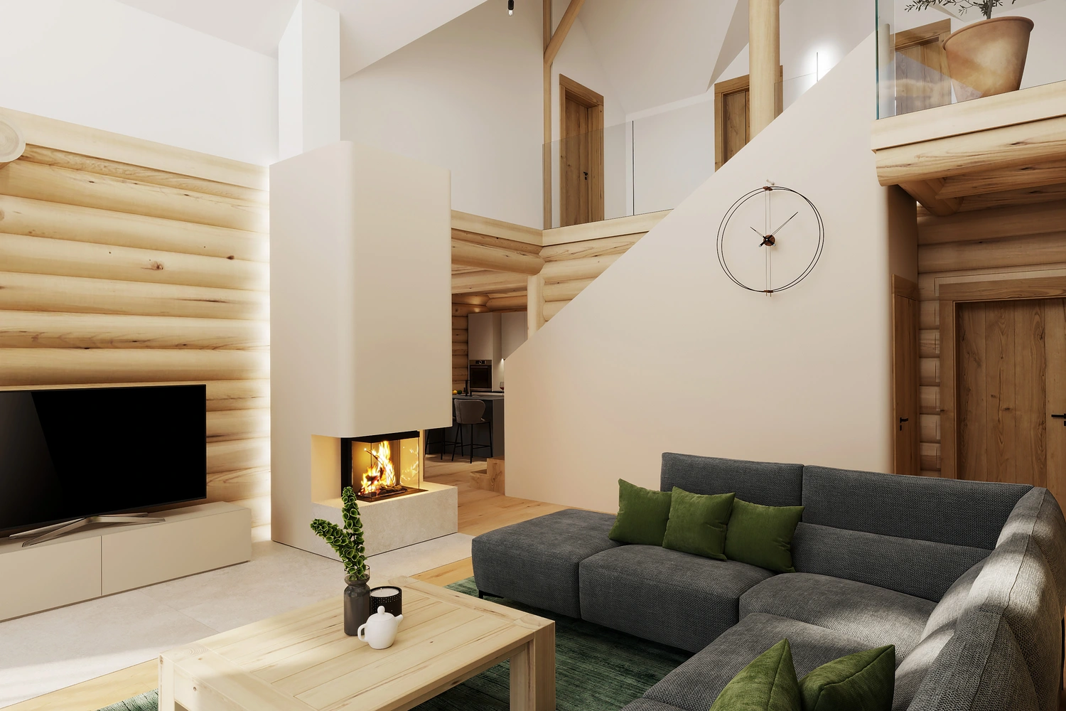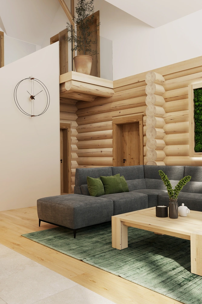 Luxusný zrub v Levoči - projekt interiéru vyniká vďaka otvoreným priestorom obývačky s galériou. Pri návrhu interiéru sme kombinovali prírodné materiály drevostavby s moderným dizajnom, čím sme vytvorili priestor, ktorý spája tradíciu a dizajn.