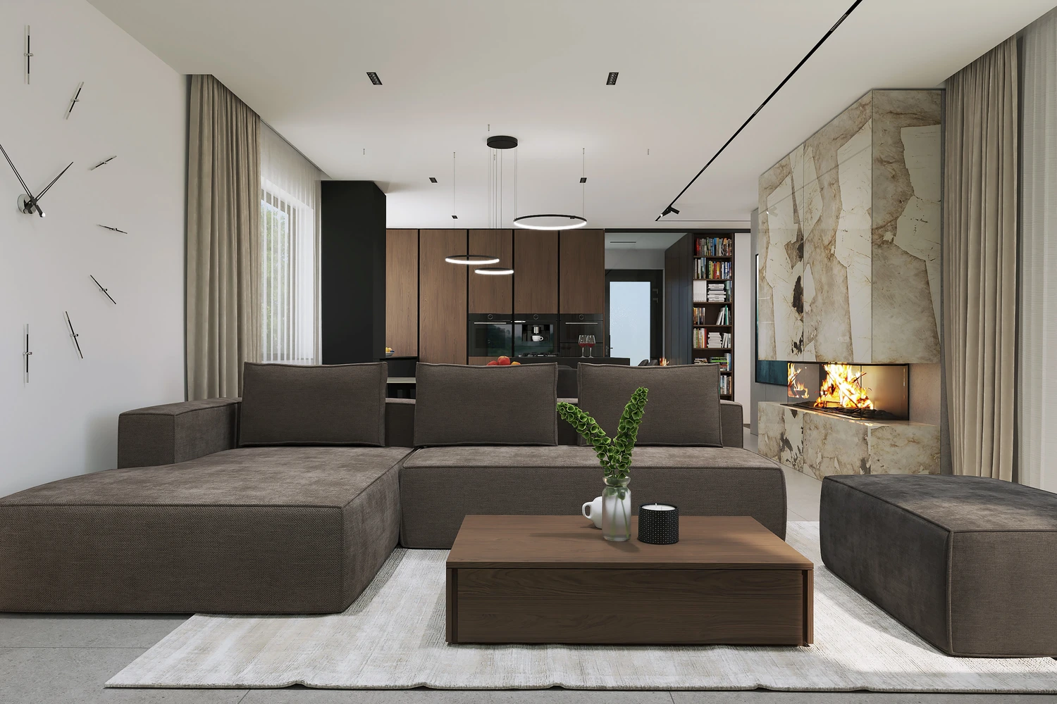 Pri návrhu obývačky v dome pracujeme s väčším priestorom, čo umožňuje pracovať s rôznymi zónami na oddych, zábavu aj rodinné aktivity. Dôležitou súčasťou obývačky v dome je veľká sedačka alebo krb, ktorý dodá miestnosti teplo a atmosféru. V domoch často pracujeme s vyššími stropmi a väčšími oknami, ktoré prinášajú dostatok denného svetla a umocňujú pocit vzdušnosti. Obývačka v dome je často prepojená aj s exteriérom vďaka veľkým oknám a terase, ktorá ďalej prechádza do záhrady, čím vytvárame plynulý prechod medzi interiérom a exteriérom. Osvetlenie v obývačke navrhujeme do niekoľkých svetelných okruhov tak aby sa dalo nastaviť podľa potreby a aktivít v priestore. Pozrite si naše naše interiéry rodinných domov.
