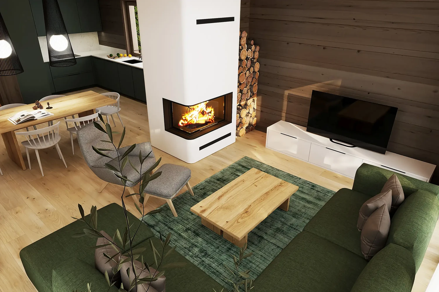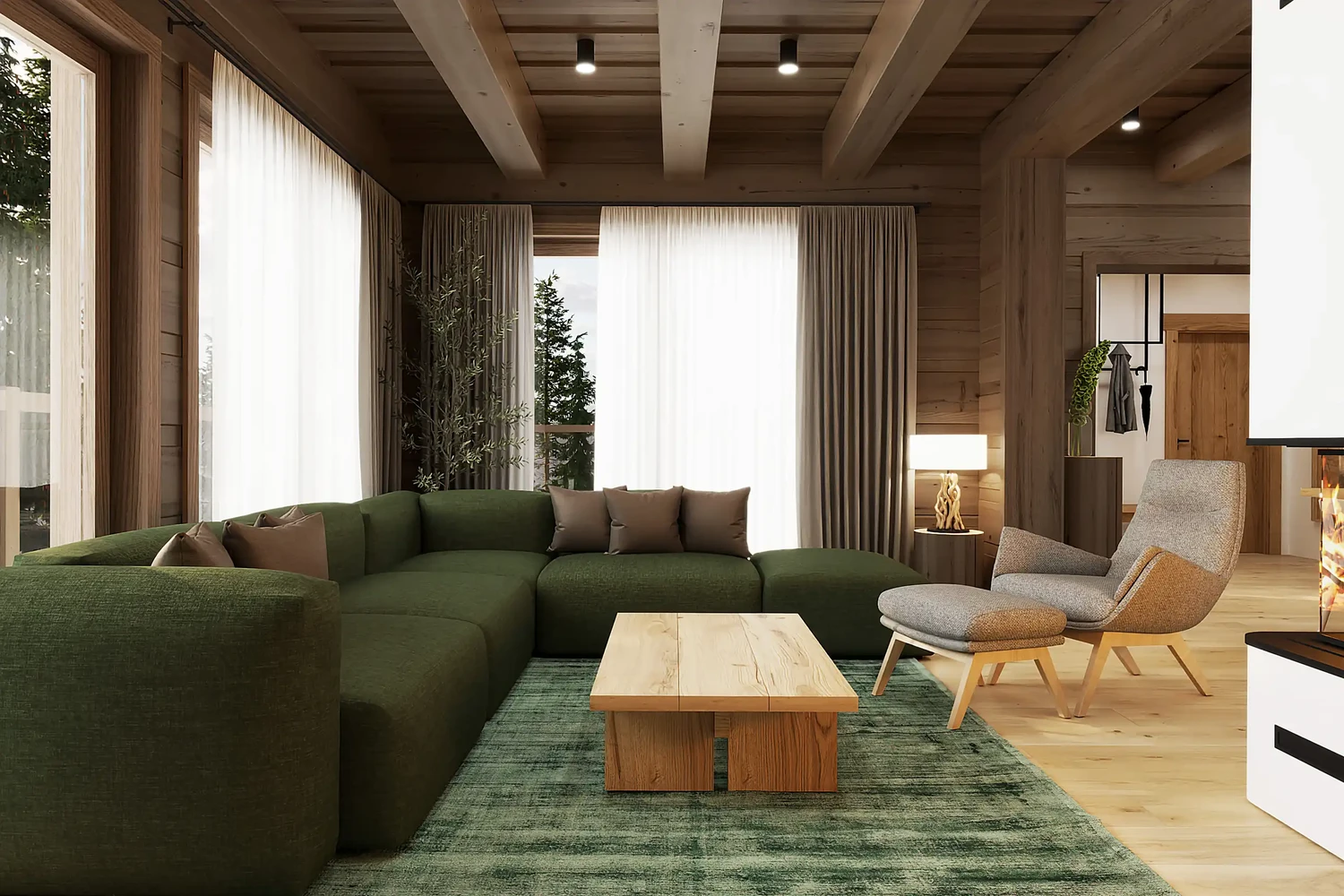 Pri návrhu obývačky na chate kladieme dôraz na útulnosť a príjemnú atmosféru, ktorá vyzýva k oddychu a úniku od ruchu mesta. Typickým prvkom sú drevené stropy, steny, krb alebo piecka, ktoré poskytujú teplo a pridávajú miestnosti autentický rustikálny vzhľad. Používame prírodné materiály, ako drevo a kameň, ktoré ladia s okolím a vytvárajú prírodný vzhľad. Mäkké textílie v sedacom nábytku alebo v doplnkoch ako vankúše, koberce a závesy pridávajú obývačke pocit útulnosti a pohodlia. Pre osvetlenie na chate doporučujeme skôr teplé svetlo, ktoré navodzuje atmosféru pokoja a oddychu. Pozrite si naše interiéry chát a dreveníc.